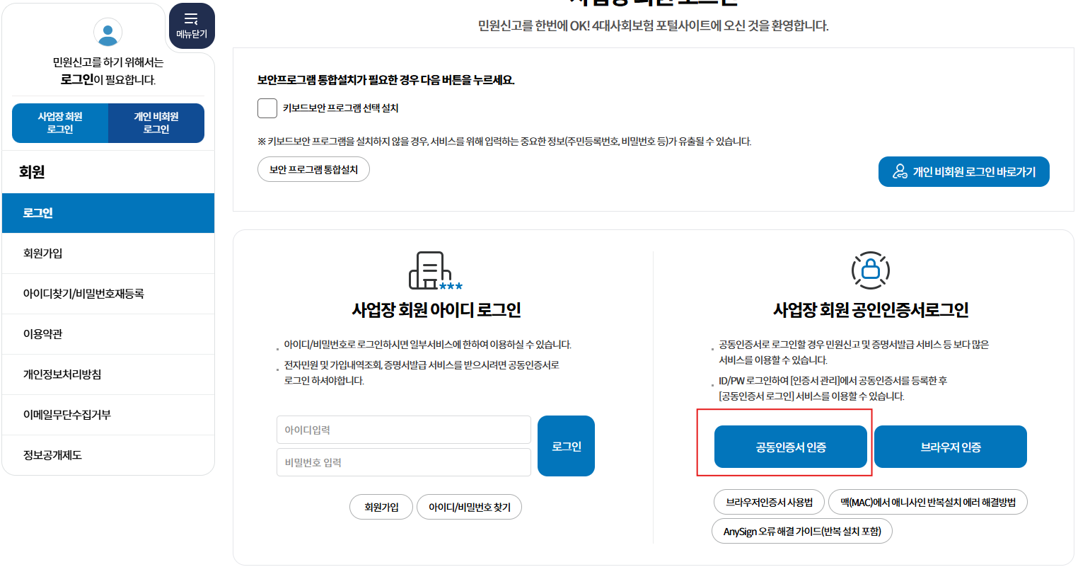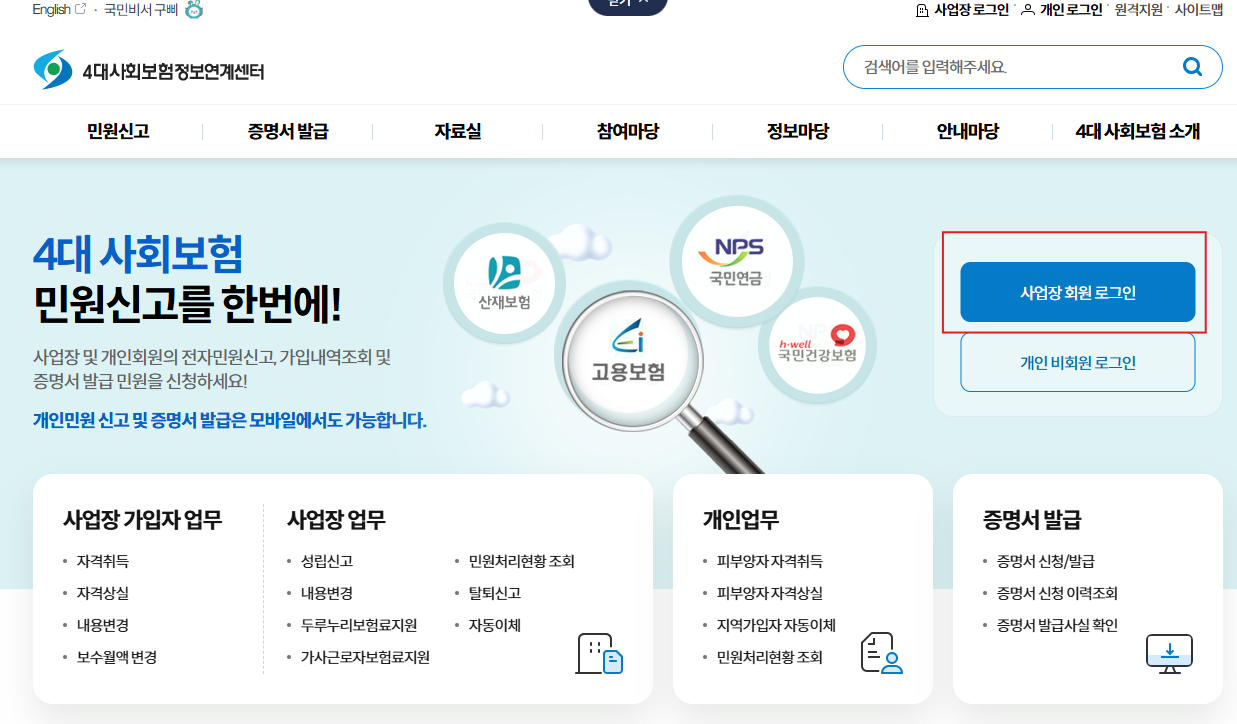 ※ 4대 보험 가입자 명부 발급 및 민원 행정 업무를 진행하려면 👉 사업장 회원 공동·금융인증서 로그인 필수입니다.