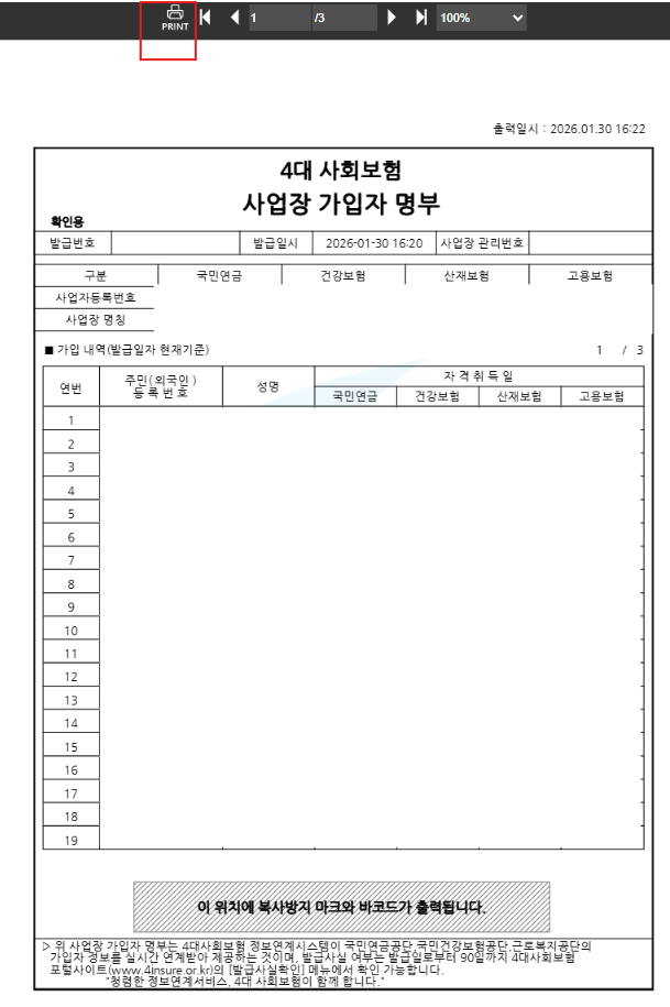 새 창이 열리면서 현재 시점 기준의 4대 사회보험 사업장 가입자 명부가 조회됩니다.
