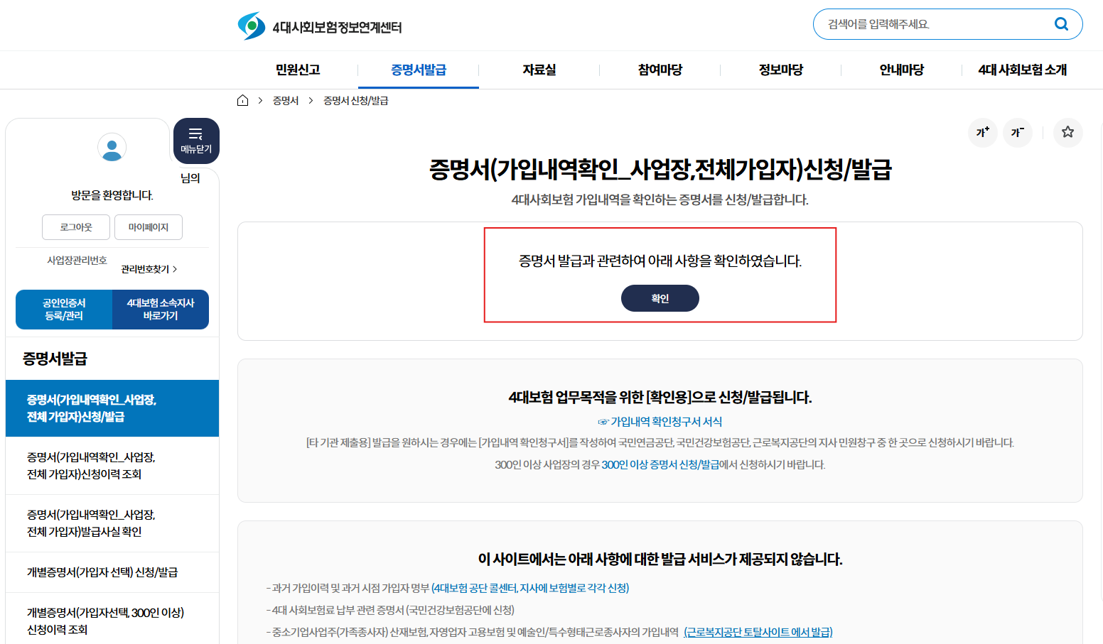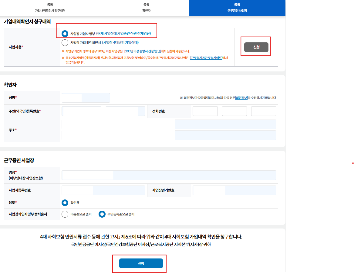 증명서 발급 → 증명서(가입내역확인_사업장, 전체가입자) 신청/발급
