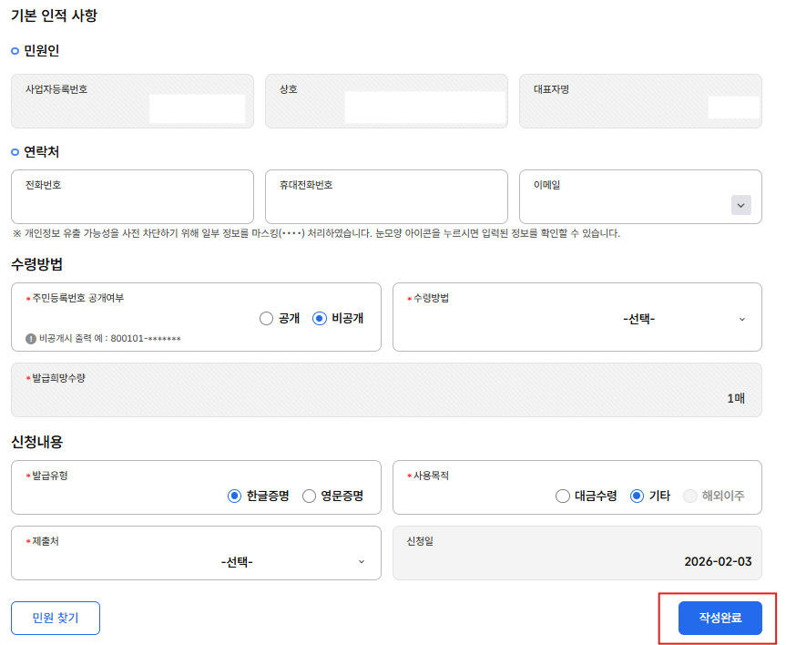 ※ 개인으로 선택 시 대표자 개인 증명서가 발급될 수 있으므로 주의