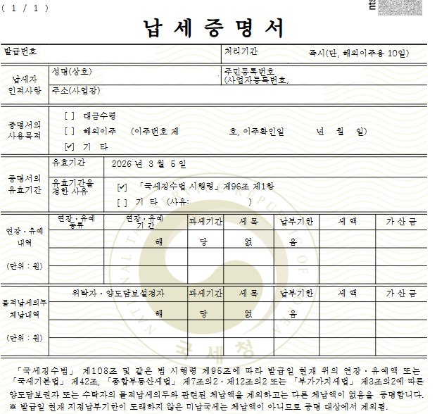 | 홈택스 국세 납세증명서 발급 방법 (개인 · PC 기준) (0) | 2026.02.02 |