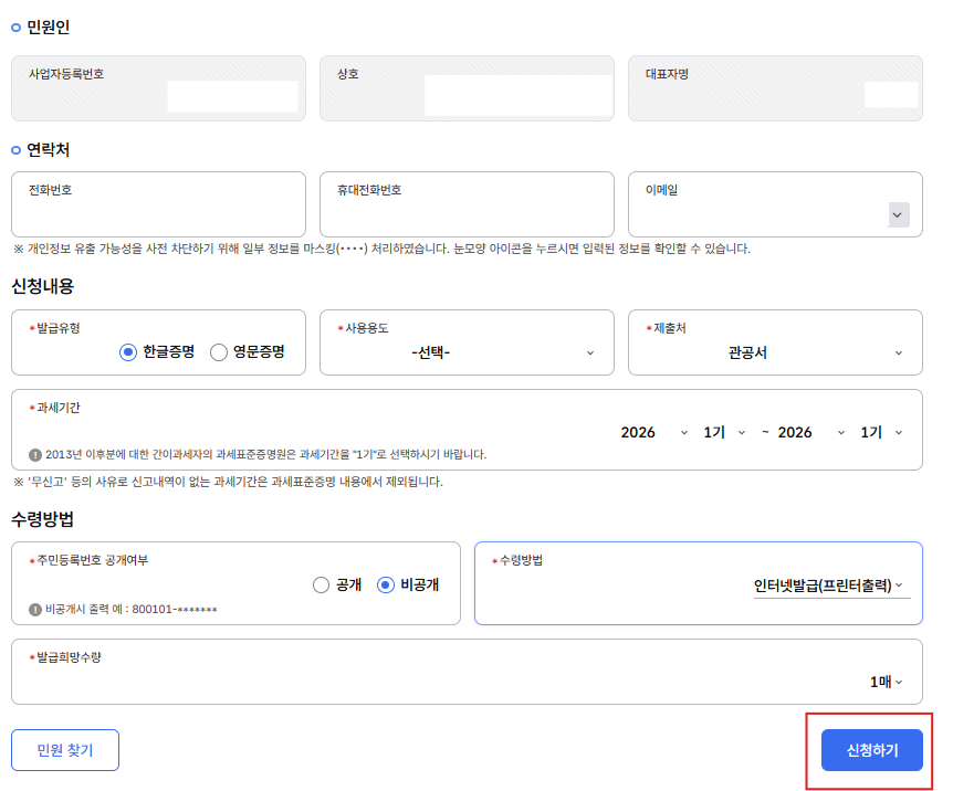 ⚠️ 부가가치세 신고가 완료된 기간만 발급 가능합니다.